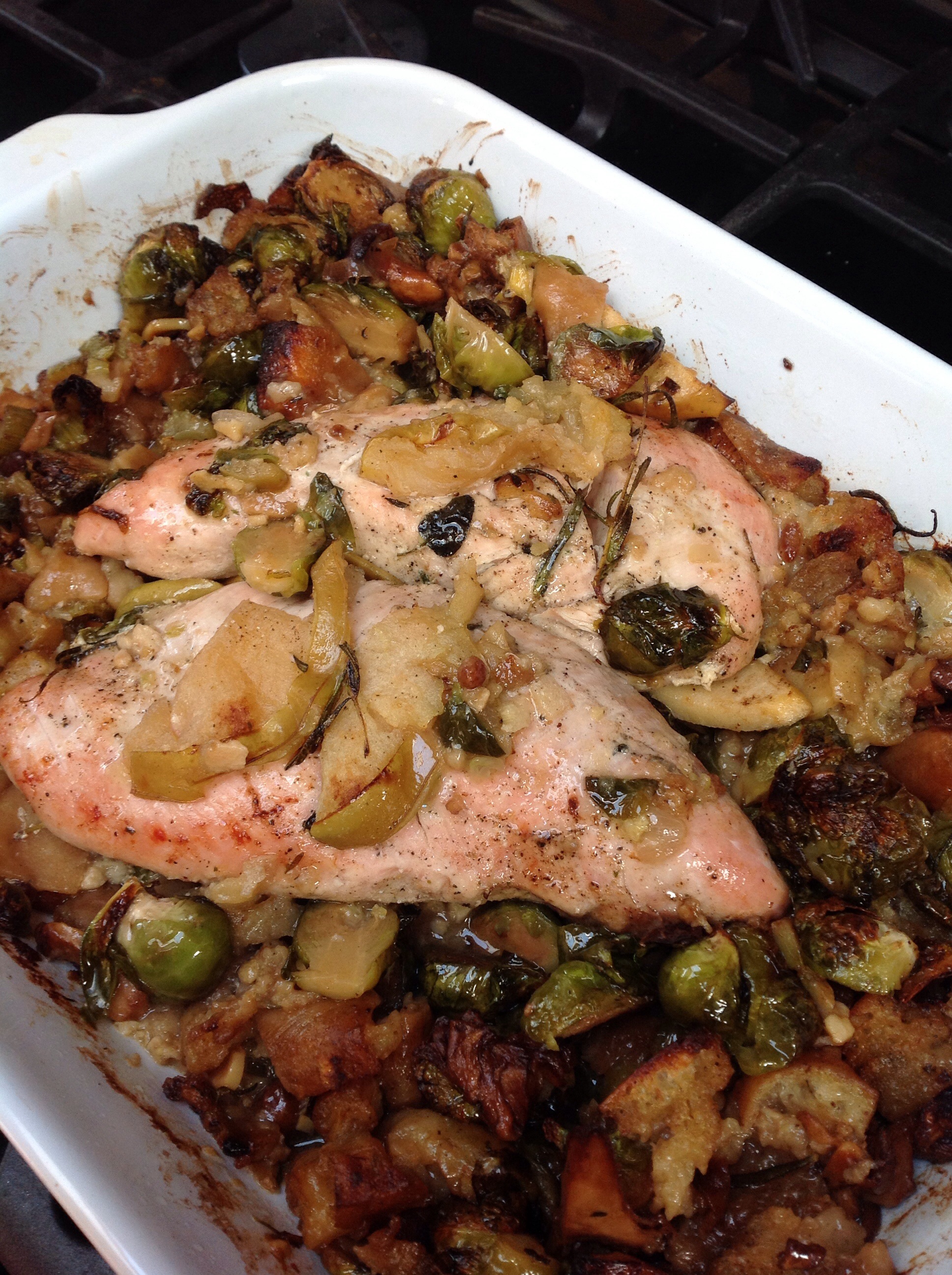 1.5-2 hours later @ 350 degrees. Turkey is juicy. Apples are caramelized. Brussels are perfectly roasted. Stuffing is delicious with all the juices from the turkey. This is an easy and way to do Thanksgiving for two. Bon appetit!
