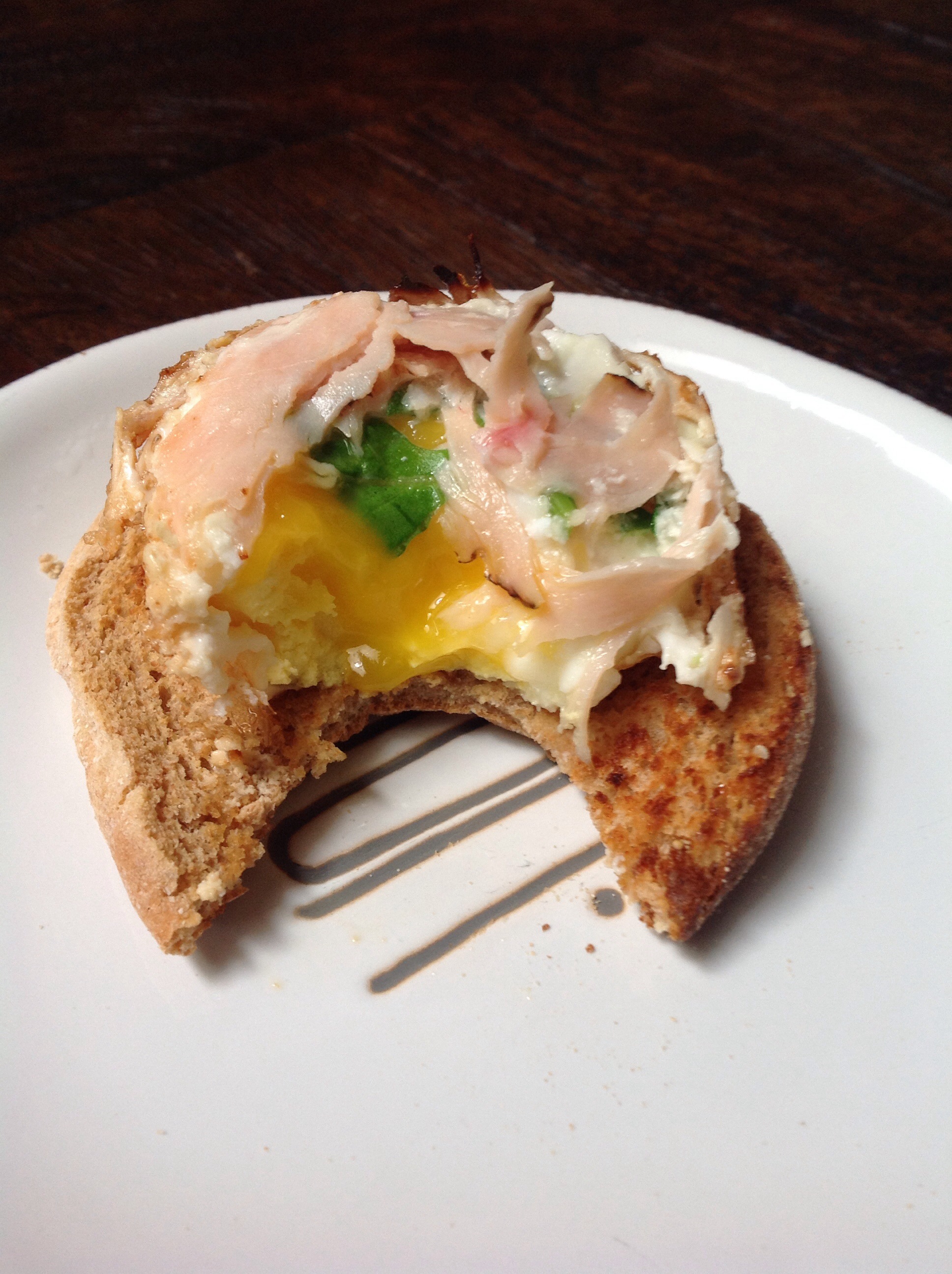 Egg is runny. Just the way I like it. I put my little egg bundle on a toasted double fiber English muffin.