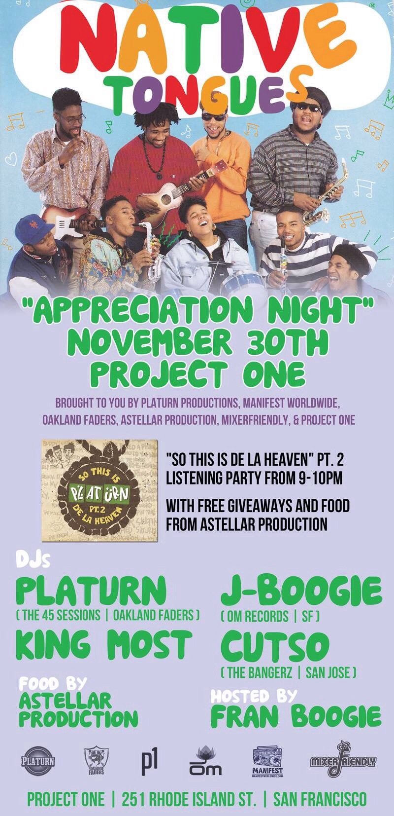 We are popping up at the Native Tongues appreciation night at Project One Gallery in San Francisco on Saturday! Think De la Soul, A Tribe Called Quest, Queen Latifah, Black Sheep, etc. Starts at 9pm. We will be selling tacos until we run out!