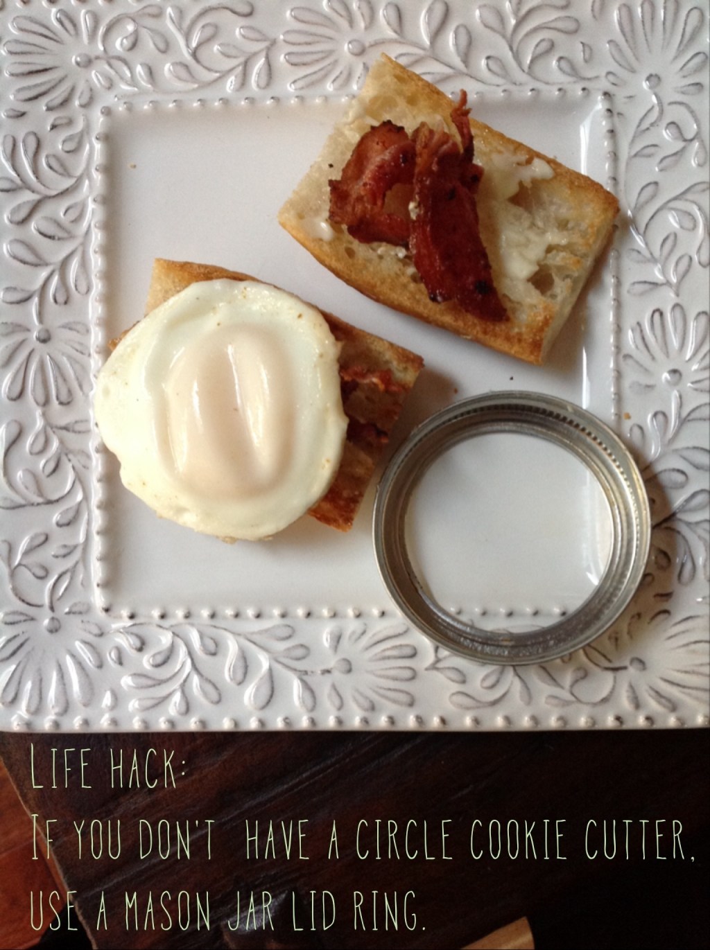 I made a fried egg sandwich for breakfast this morning, but boy was my egg an UGLY, messy shape. I wanted to use a circle cookie cutter to cut around this mess after I cooked it. Alas, I didn’t have one, but out of the corner of my eye I saw a mason jar lid ring! I popped out the lid top and cut a perfect circle out of my ugly egg. Success! Life hacked.