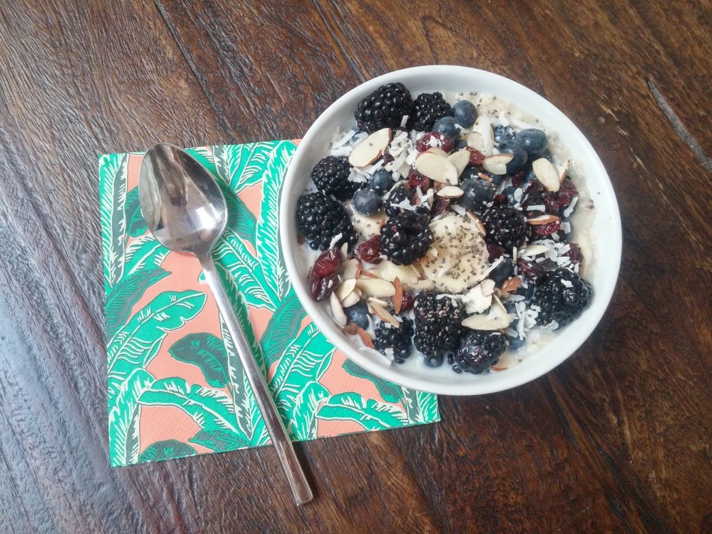 gluten free steel cut oats +organic bananas + blueberries + blackberries + sliced almonds + cranberries + chia seeds + shredded unsweetened coconut + califia farms unsweetened almond milk.