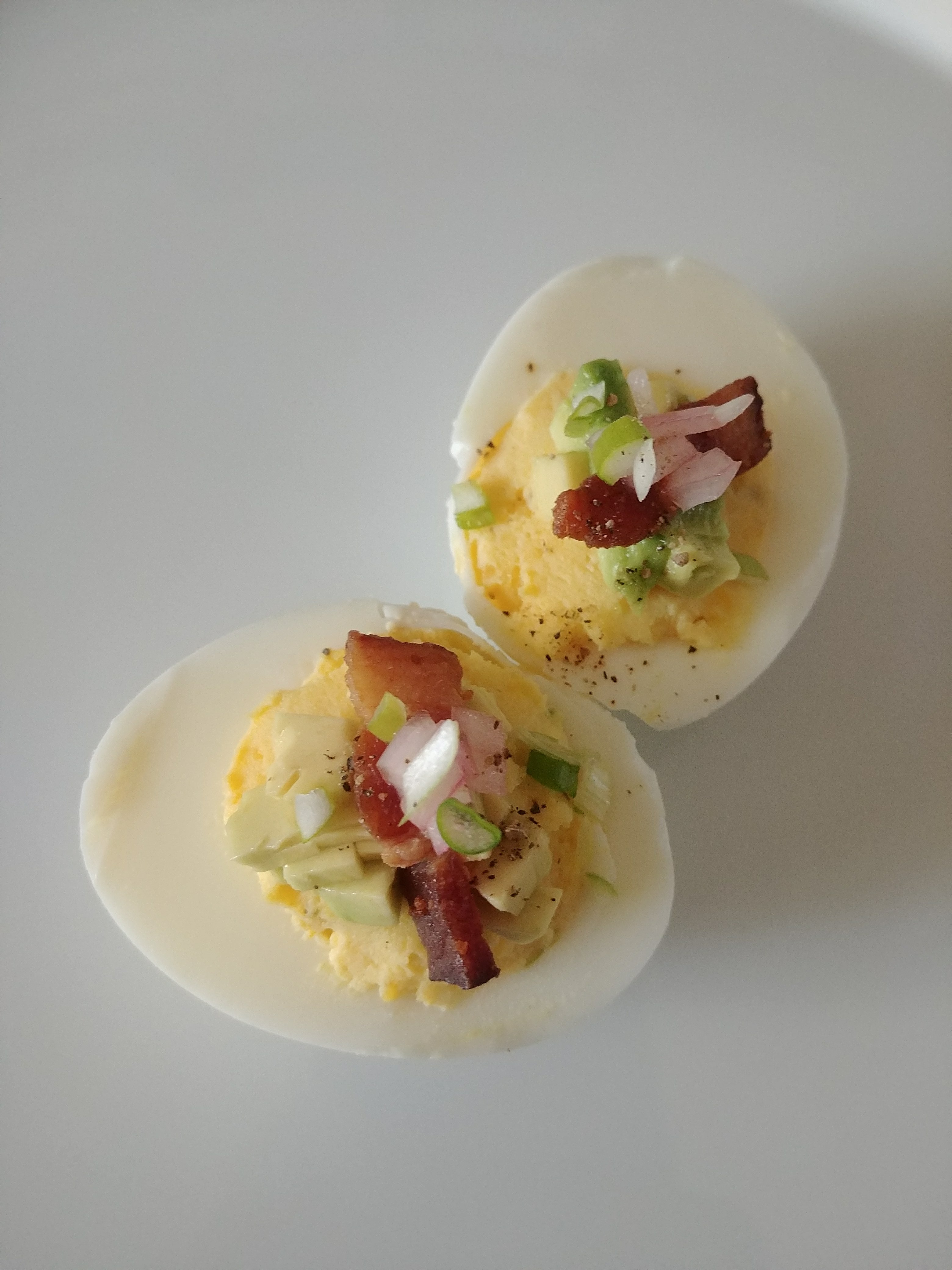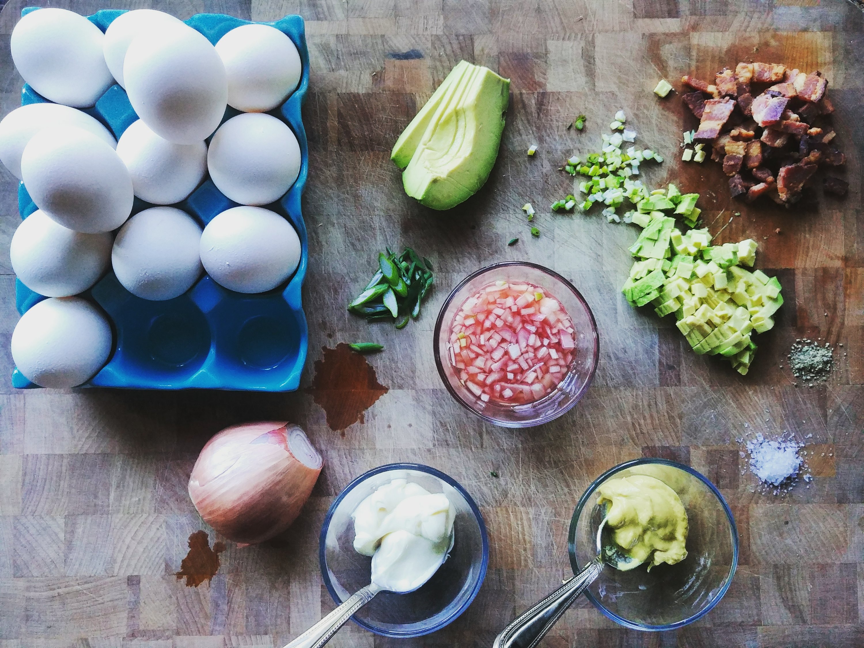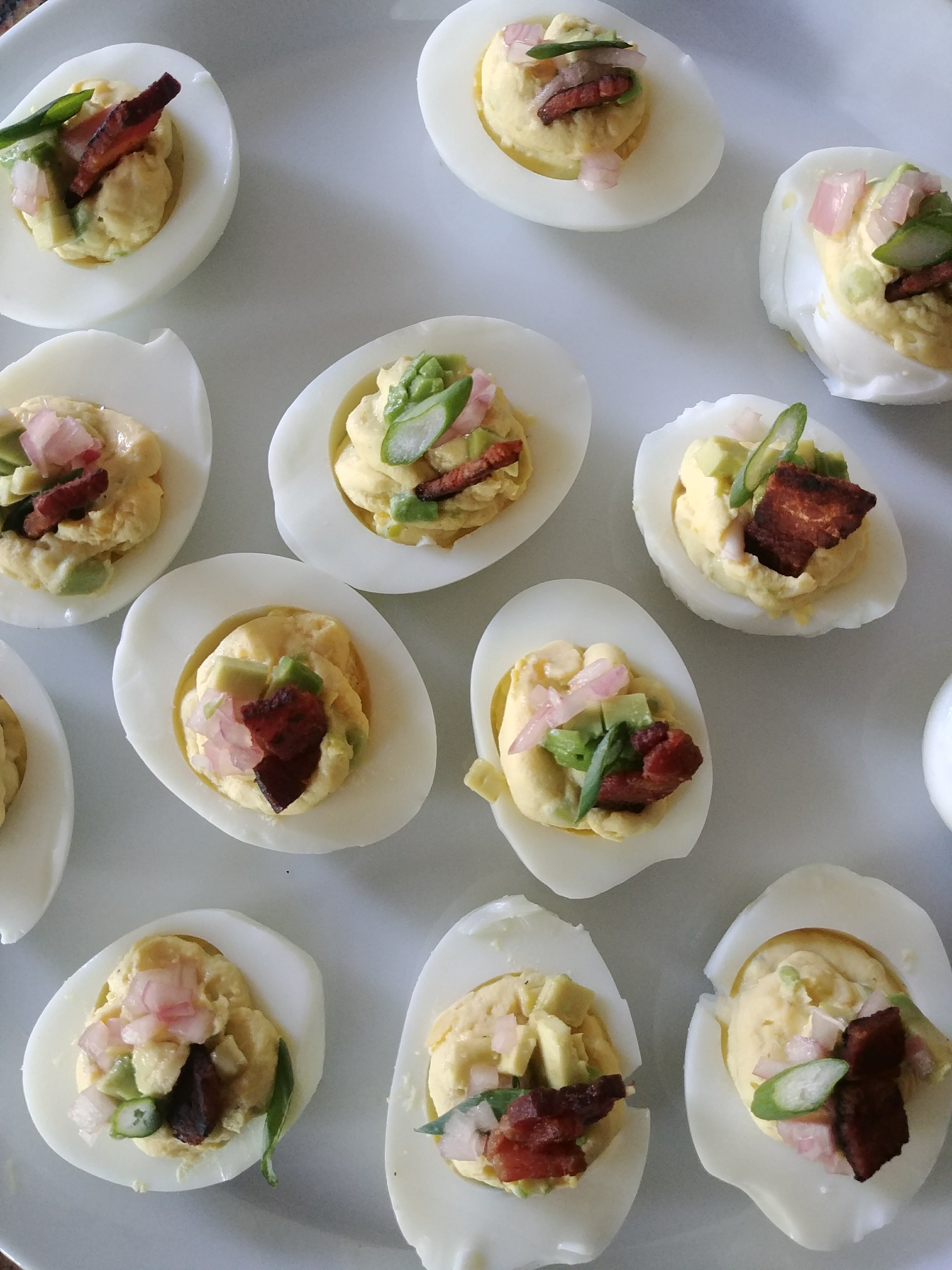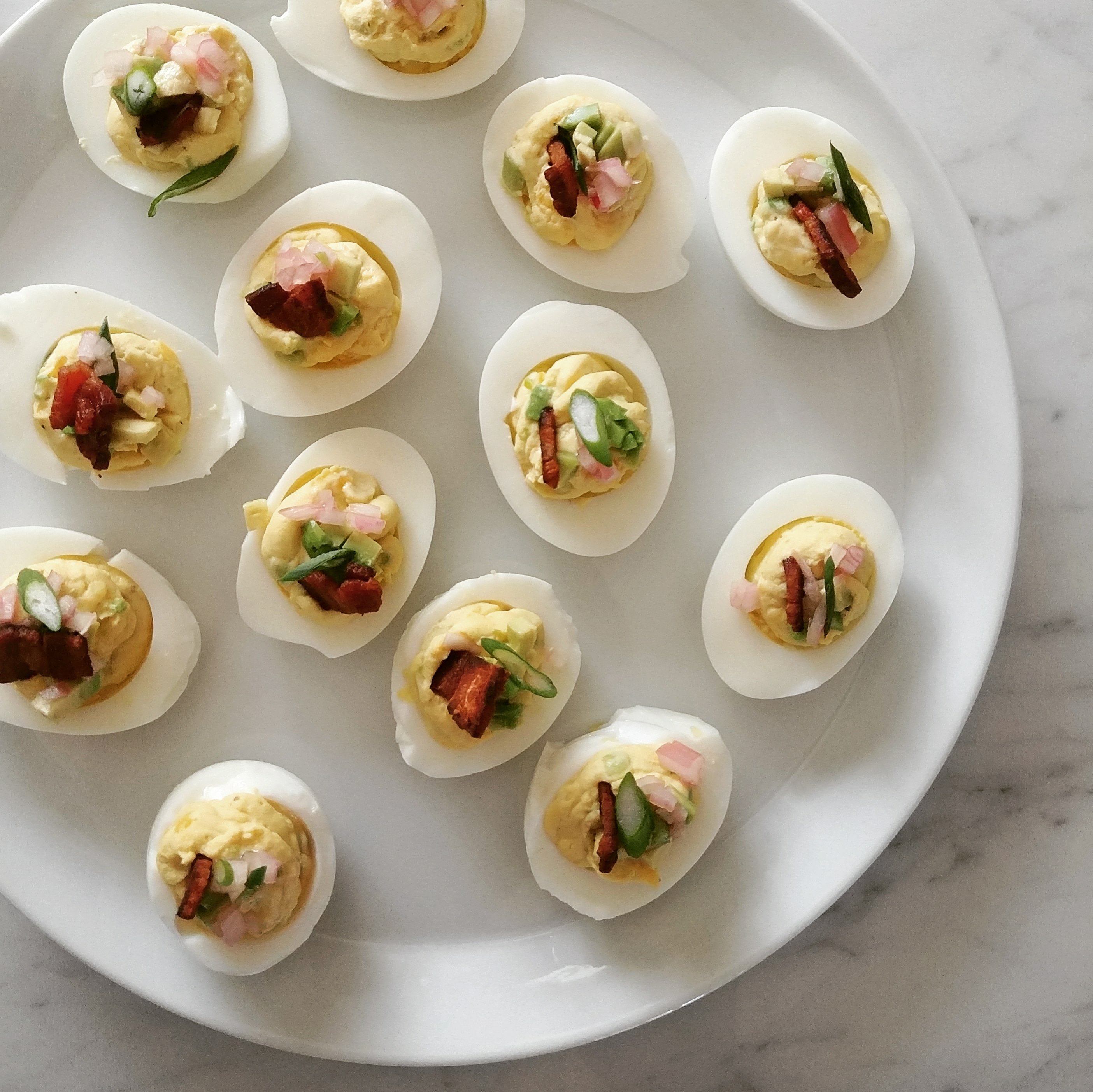 astellar deviled eggs + pickled shallots + avocado + bacon + spring onion.