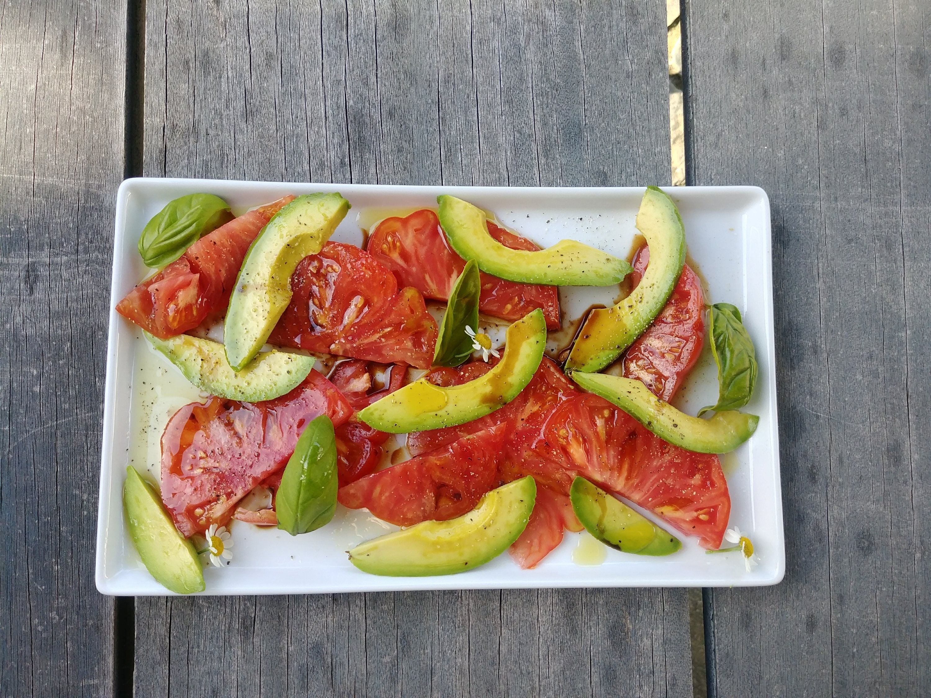 Here is astellar heirloom tomato + avocado + olive oil + maldon sea salt + cracked pepper + balsamic vinegar + basil from my herb garden.