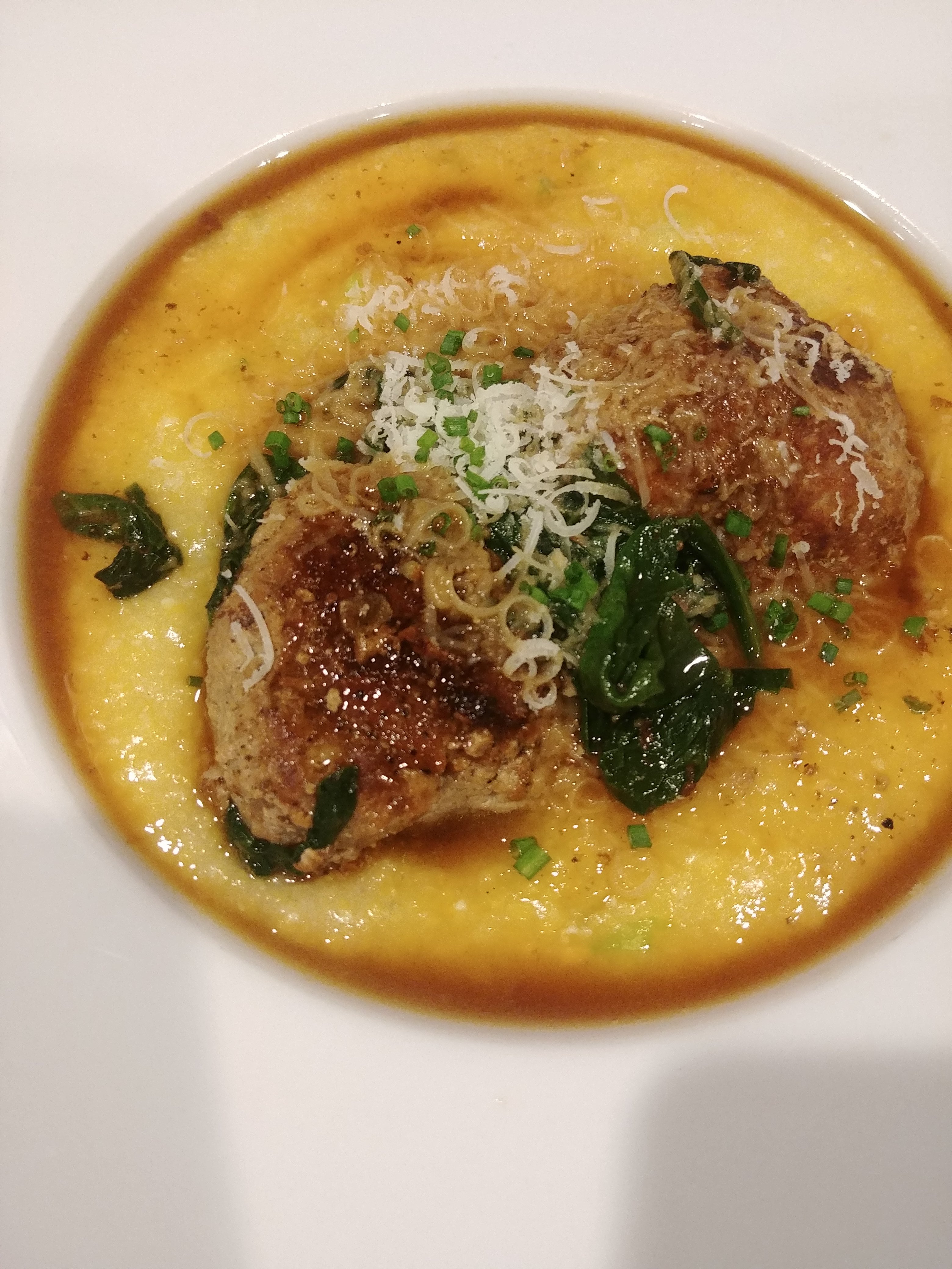 astellar turkey meatballs + polenta + spinach + pan sauce jus.