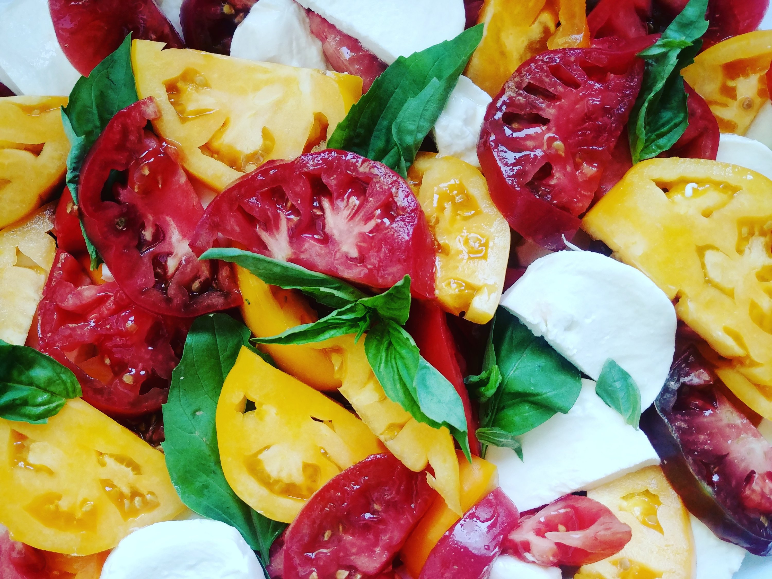 heirloom tomatoes + fresh mozzarella + basil + olive oil + lemon + maldon sea salt + cracked pepper.