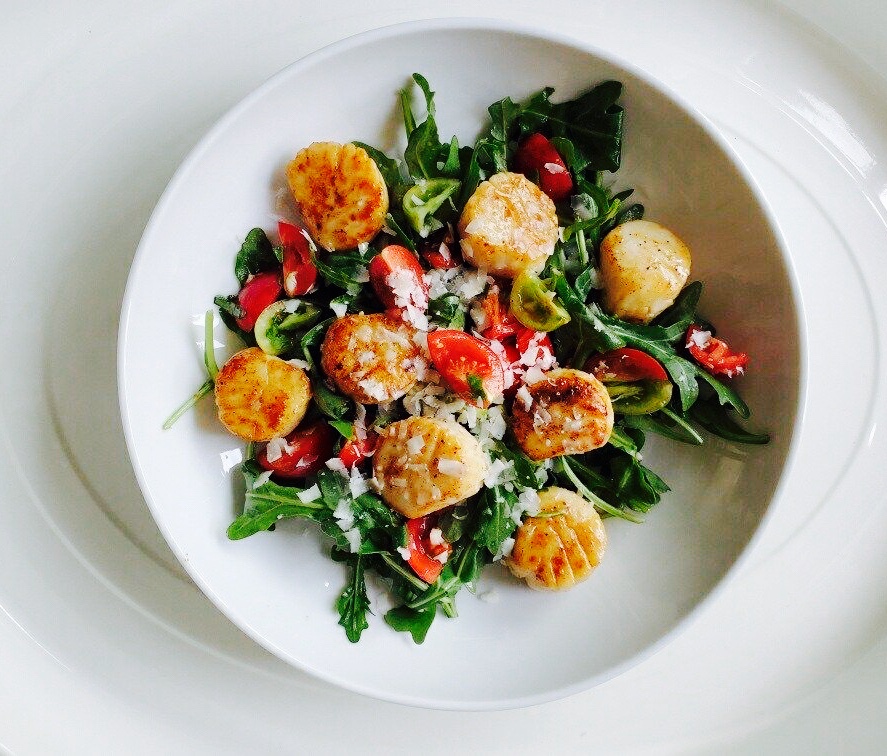astellar seared scallops served over a simple arugula salad lightly dressed with maldon salt + olive oil + red wine vinegar + cherry tomatoes tossed in olive oil + garlic + fresh basil + squeeze of lemon + salt + pepper + freshly grated parmesan over the hot scallops.